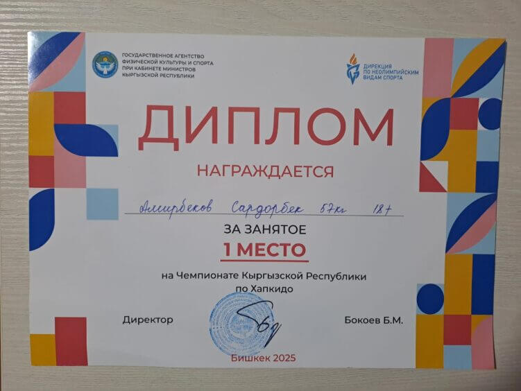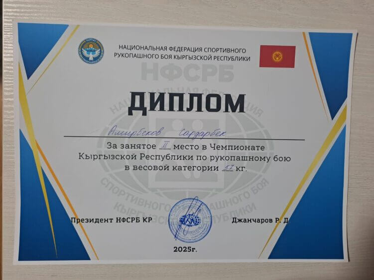 Студент 3 курса Амирбеков Сардарбек ,занял 1 место на чемпионате Кыргызской Республики по Хапкидо, 2 место в чемпионате Кыргызской Республики по рукопашному бою.Участвует во многих спортивных мероприятиях.