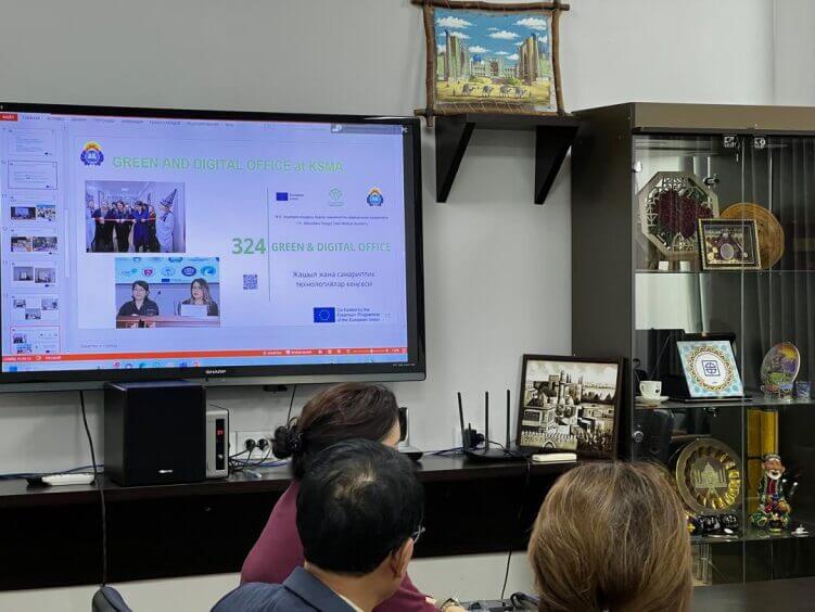 Заведующая отделом международных связей КГМА Т.Б. Юсупова представила информацию о международных проектах академии, уделив особое внимание проекту Erasmus+ GREENKG. В рамках данного проекта в КГМА был создан Офис зелёных и цифровых технологий, где в настоящее время работает эксперт KOICA. В своем выступлении она рассказала об основных результатах проекта, проведённых мероприятиях и дальнейших планах развития инициативы.